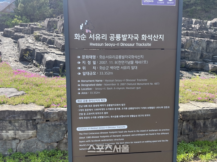 서유리 공룡발자국 화석산지는 고인돌보다 더 이전 시기로 돌아간다. 약 9000만년 전 중생대 백악기 후기층에서 발견됐다. 뚜렷한 발자국이 눈에 띈다. 약 60여 개 육식공룡 발자국들의 긴 보행렬(최대 52m)이 나타나 있다. 단일 지역에서 무려 1500점 이상이 발견됐다. 화순이라는 지역이 분명 신묘한 힘을 갖고 있다고 밖에 볼 수 없다. 죽어서도 족적을 남긴 고대인과 공룡이라니.