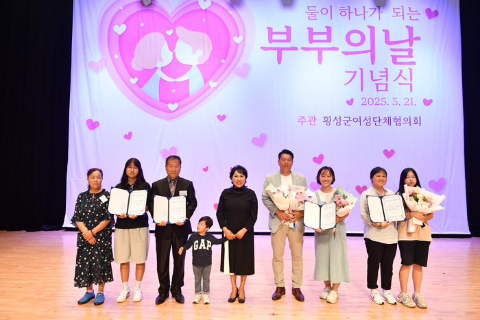 김명기 횡성군수, 표한상 군의회의장, 여성단체협의회원, 마을주민 등 300여 명이 참석한 가운데 1부 축하공연과 부부특강을 시작으로 2부 기념식에서는 올해의 부부상 시상, 다둥이가정 후원금 전달 등이 이어지며 따뜻하고 감동적인 분위기를 연출했다.