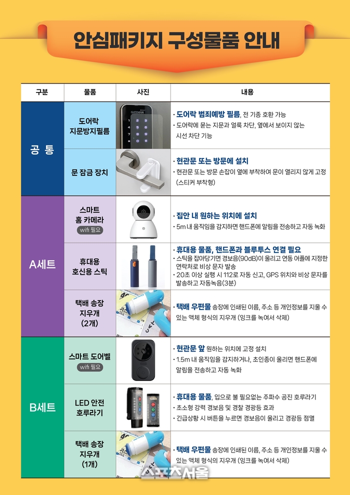 A세트는 스마트 홈 카메라, 휴대용 호신용 스틱, 택배송장 지우개(2개)이며, B세트는 스마트 도어벨, LED안전호루라기, 택배송장 지우개(1개)이다.