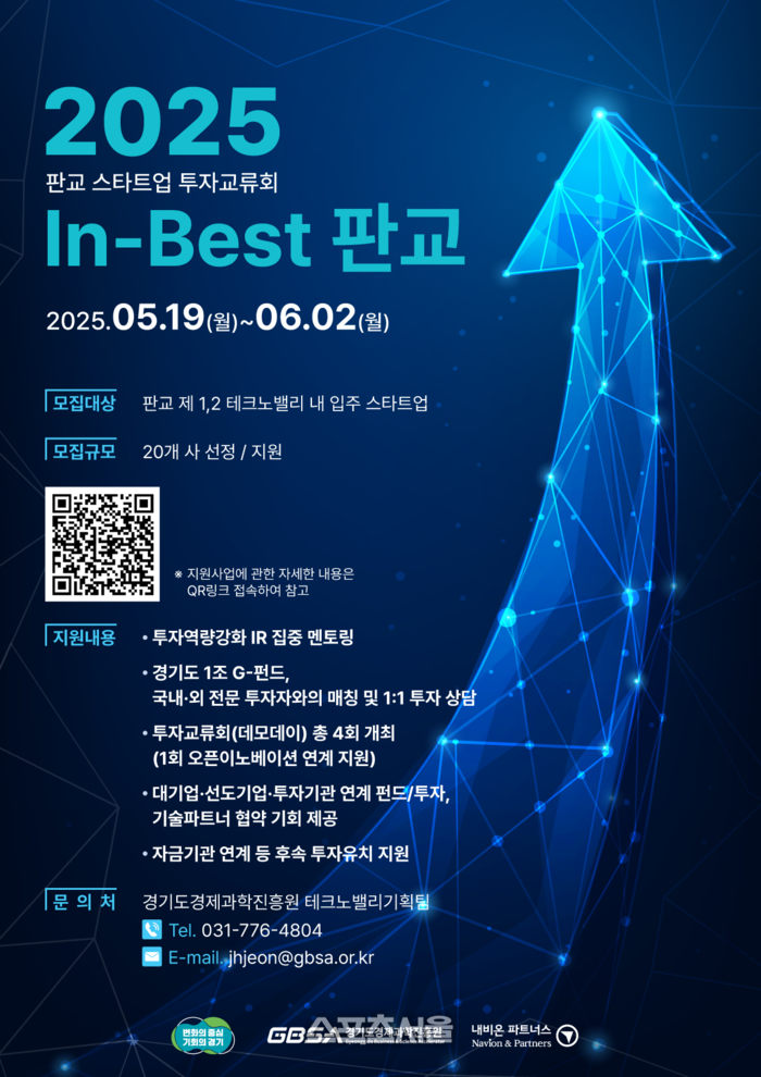 경과원은 이번 사업을 통해 투자유치가 필요한 스타트업들이 성장 기회를 확보하고, 지역 투자 생태계와의 연결을 통해 글로벌 시장 진출 가능성을 높일 수 있을 것으로 기대하고 있다. ‘In-Best 판교’ 참여는 경기기업비서 홈페이지에서 하면된다.