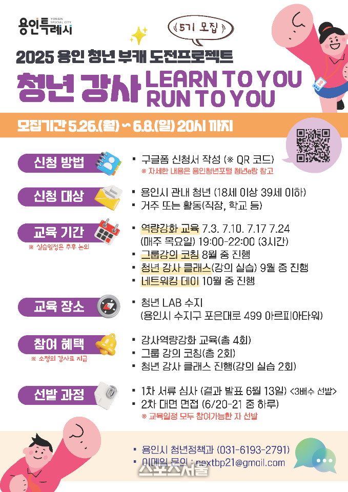 신청은 용인청년포털 ‘청년e랑’에서 확인하고, QR코드 온라인 링크를 통해 제출하면 된다. 서류심사와 면접심사를 거쳐 합격자는 다음 달 25일 개별통보한다.