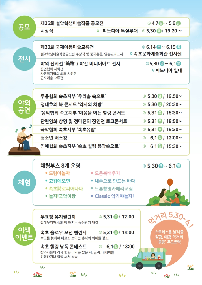 행사장 내에는 시민들이 직접 문을 뉘어 쉴 수 있는 캠핑존과 해먹 쉼터가 설치되며, 봄의 끝자락에서 속초의 자연과 어우러진 예술 속 휴식 공간이 마련된다.