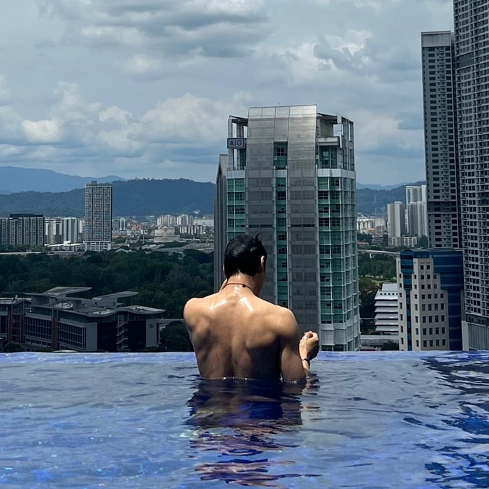 인피니티 풀에서 찍은 사진이다. 수영장 밖으로 고층 빌딩이 펼쳐진 가운데, 상의를 탈의한 채 물에 몸을 담그고 있는 카이의 뒷모습이다. 단연 시선을 잡아끄는 것은 카이의 놀라운 근육질 뒷태다. 한눈에 봐도 어마어마한 근육질 몸매다. 건강미 관리를 위해 카이가 쏟았을 남다른 노력이 느껴진다. 해외 일정 중에 찍은 사진으로 보인다.