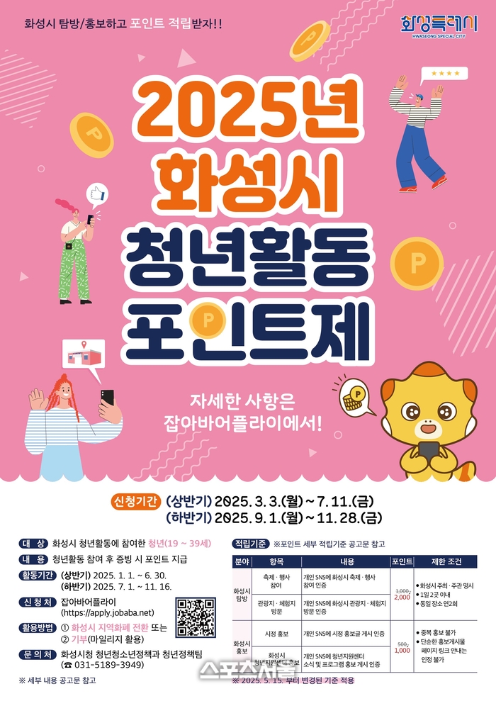 탐방 활동과 시정·청년지원센터 홍보 활동의 적립 포인트도 인상했다. 축제·관광지 방문 등 탐방 활동 시 기존 1000포인트에서 2배 인상된 2000포인트를, 시정 및 청년지원센터 홍보 활동은 기존 500포인트에서 2배 인상된 1000포인트를 받을 수 있다.