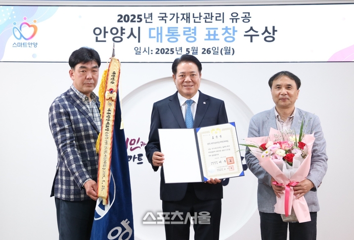 〔스포츠서울│안양=좌승훈기자〕최대호 안양시장은 지난해 11월 말 안양농수산물도매시장 청과동 붕괴 사고에 선제적으로 대처해 행정안전부의 ‘2025년 국가재난관리 유공’ 대통령 표창을 받은 것과 관련 26일 전수식을 갖고 “재난은 언제든 발생할 수 있지만, 철저한 준비와 대응으로 이를 최소화할 수 있다”며 “이번 수상은 안양시 전체의 재난 대응 철학이 시정에 실현된 결과로, 앞으로 더욱 철저한 안전망을 구축해 나가야 할 것”이라고 말했다.