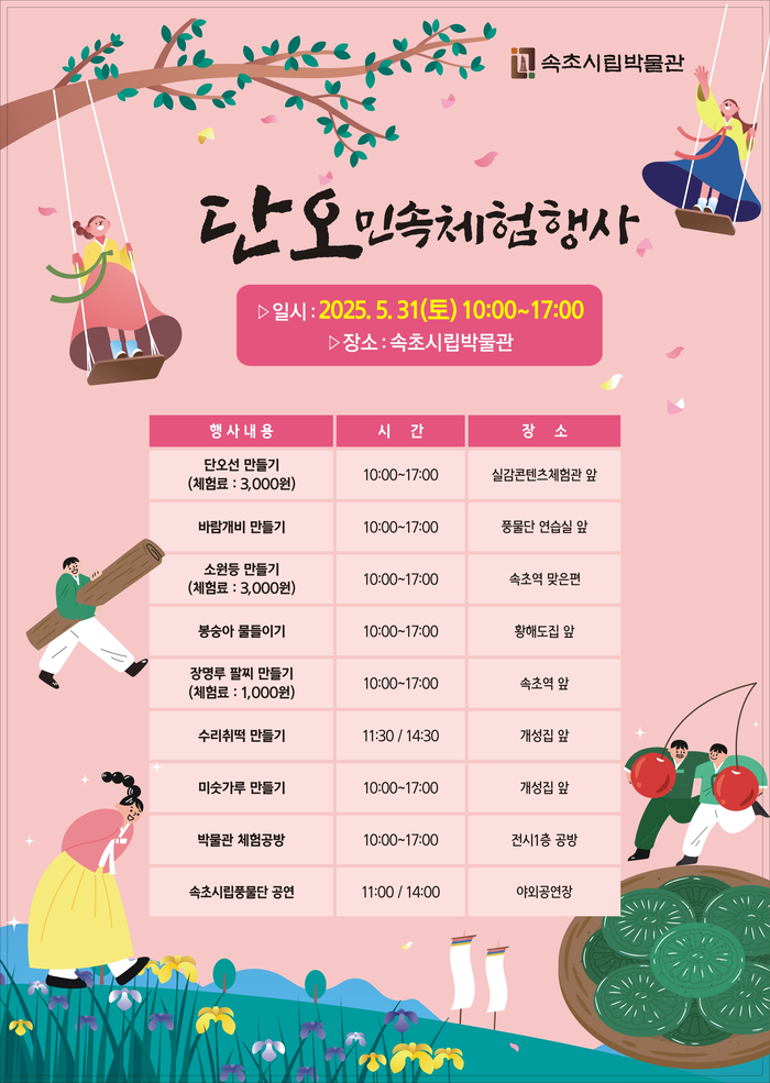 단오선 만들기를 비롯해 바람개비·소원등·장명루 팔찌 만들기, 봉숭아 물들이기 등의 체험행사, 수리취떡과 미숫가루 만들기 등 다양한 프로그램이 마련된다. 또한, 오전 11시와 오후 2시에는 속초시립풍물단의 신명나는 공연이 진행되며 관람객들의 흥을 돋울 예정이다.