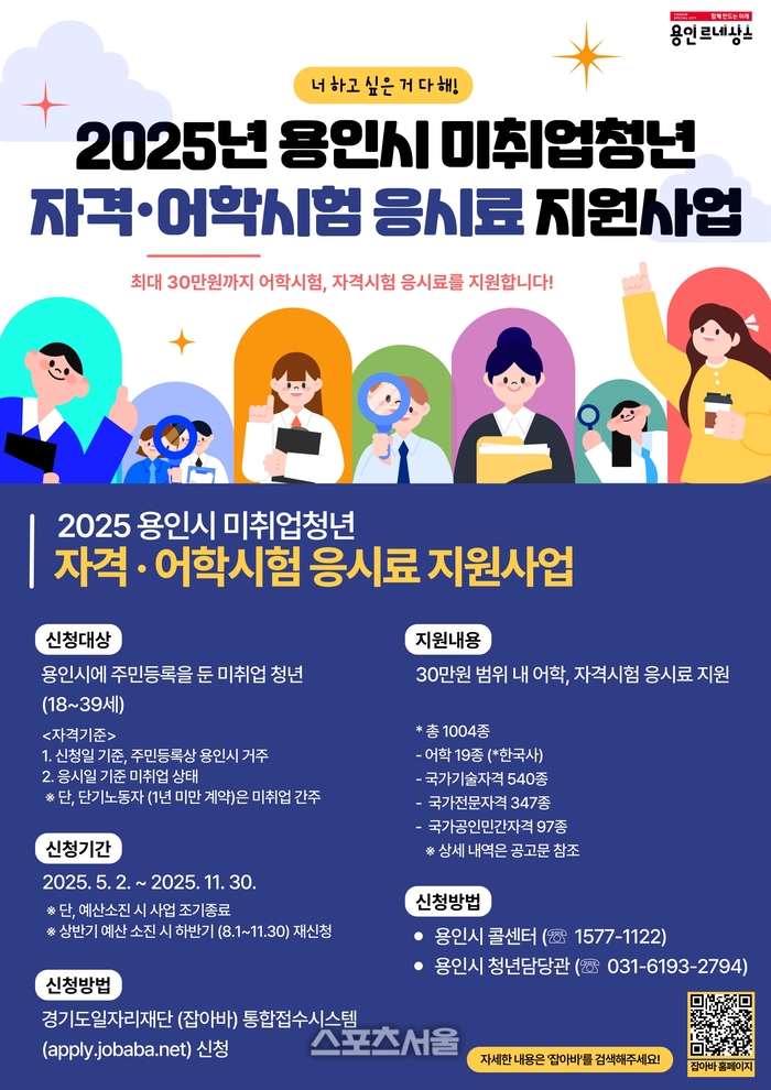 〔스포츠서울│용인=좌승훈기자〕경기 용인시는 취업을 준비하는 청년들을 위해 어학과 자격시험 응시료를 최대 30만원까지 지원한다고 27일 밝혔다.