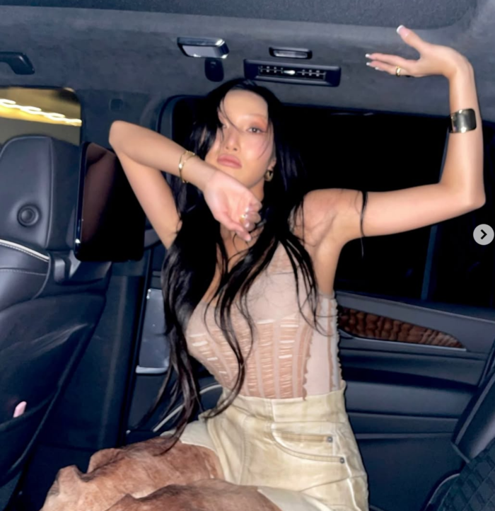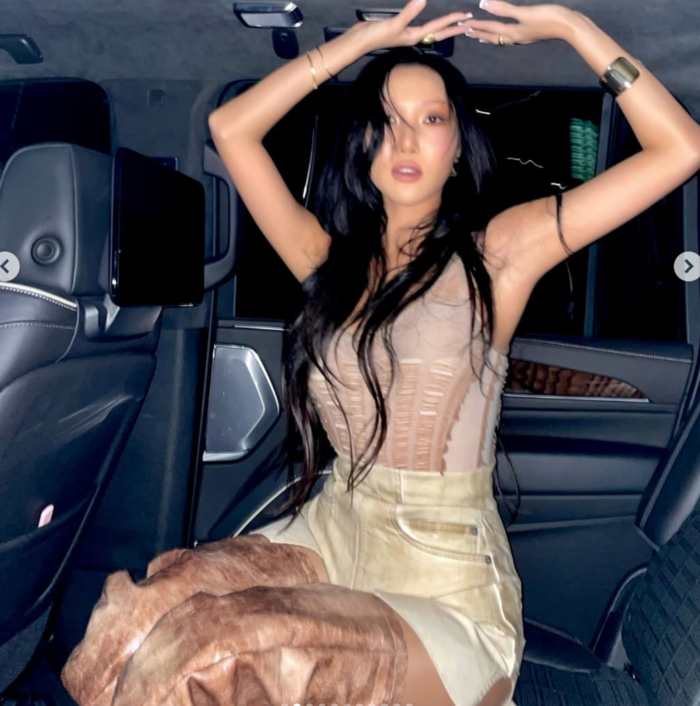화사는 27일 자신의 SNS에 코멘트 없이 여러 장의 사진을 공개했다. 사진 속 화사는 차 안에서도 다양한 포즈를 취하며 매력을 발산했다.