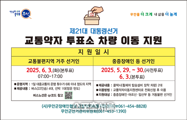 이용 신청은 오는 6월 3일까지 무안군선거관리위원회(☎061-453-1390), 무안군 교통약자이동지원센터(☎061-454-8828)로 하면 된다.