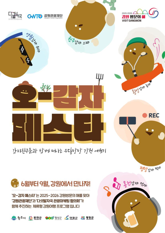 [스포츠서울ㅣ춘천=김기원기자]강원관광재단(대표이사 최성현, 이하 재단)은‘2025-2026 강원 방문의 해’를 맞아 다섯발자국 공동 홍보 마케팅 사업 일환으로 영서 내륙 5개 시군과 손잡고 새로운 체류형 관광 상품‘오감자 페스타’를 6월 6일(금) 평창을 시작으로 선보인다고 밝혔다.