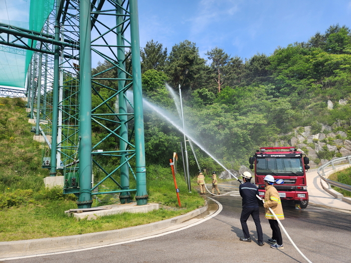산불이 한마음센터까지 번진 상황에서 긴급 진화를 위해, 본부 소화수 계통부터 약 500m에 이르는 호스를 연결하여 안정적으로 소화수를 공급했다.