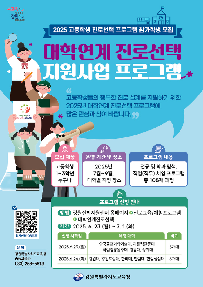 이번 사업에는 도내 10개 대학(△가톨릭관동대 △강원대 △강원도립대 △경동대(문막) △국립강릉원주대 △상지대 △한국골프과학기술대 △한라대 △한림대 △한림성심대)이 참여한다. 도내 고등학생 1,722명을 모집하여 대학별로 차별화되고 특화된 105개의 진로 탐색 및 설계 프로그램을 7월부터 제공할 예정이다.