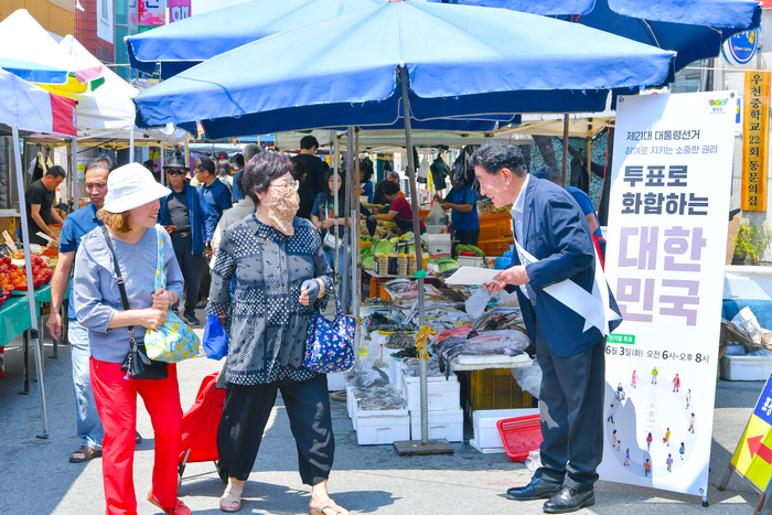 김 군수는 시장을 오가는 주민들을 만나 신성한 한 표의 소중함을 강조하고 군민의 선거 참여를 독려했다.
