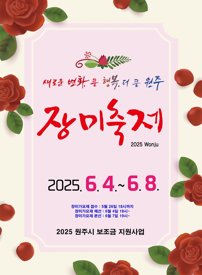 장미축제는 원주의 시화인 ‘장미’를 테마로 장미가요제 예·본선, 지역예술팀 축하공연, 런웨이 패션쇼 등의 공연과 페이스페인팅, 캐리커처, 장미브로치 체험 등 다양한 참여 프로그램으로 구성되어 방문객에게 특별한 경험을 선사할 예정이다.