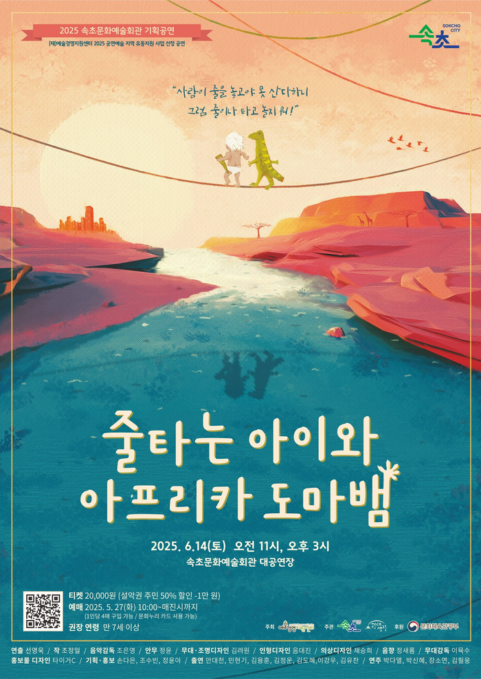[스포츠서울ㅣ김기원기자]예술경영센터가 주최하고 속초시와 광대생각이 주관하는 전통 연희극 ‘줄 타는 아이와 아프리카 도마뱀’이 오는 6월 14일 오전 11시와 오후 3시에 속초문화예술회관에서 공연한다.
