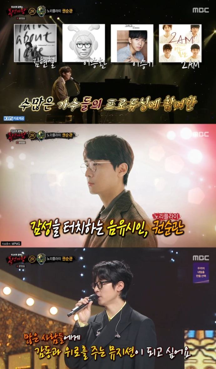 이날 방송에서는 권순관에 대해 이승환·성시경·정승환·권진아·규현 등 숱한 뮤지션들과 협업해온 작곡가이자 프로듀서로도 소개됐다. 판정단으로 참여한 2AM의 창민 역시 “2013년 2AM의 ‘위로’를 써주신 작곡가님이라 2AM과도 인연이 깊은 분이신데, 못 알아봐서 죄송하다”며 훈훈한 분위기를 자아냈다.