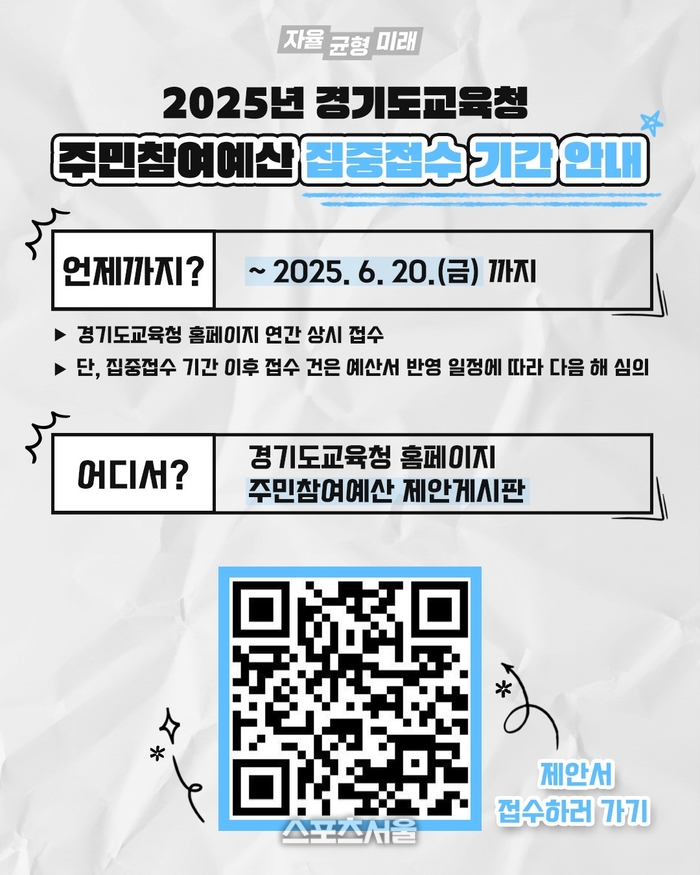 〔스포츠서울│수원=좌승훈기자〕경기도교육청은 오는 20일까지 ‘2025년 주민참여예산 제안서 집중접수’를 운영한다고 2일 밝혔다.