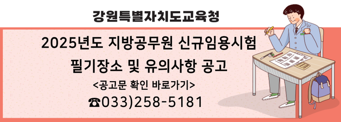 자세한 내용은 강원특별자치도교육청 누리집>소식·시험·채용>인사/시험정보-임용시험-지방공무원시험 게시판의 2025년도 강원특별자치도교육청 지방공무원 신규임용시험 필기시험 장소 및 응시자 유의사항 공고를 통해 확인할 수 있다.