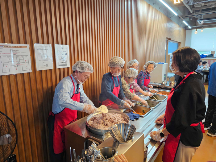 [스포츠서울ㅣ춘천=김기원기자]육동한 춘천시장이 2일 소양강댐노인복지관을 찾아 어르신 150여 명을 위한 점심 배식 봉사에 참여했다.