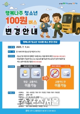 한편 ‘행복 나주 청소년 100원 버스’ 정책에 대한 세부 사항은 나주시청 누리집 또는 읍면동 행정복지센터, 각급 학교에서 확인할 수 있다.