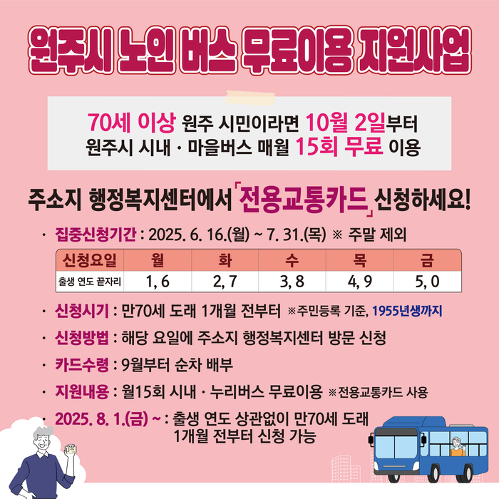 한편, 신청 관련 문의는 주소지 행정복지센터 또는 원주시 대중교통과(☎033-737-3504)로 하면 된다.