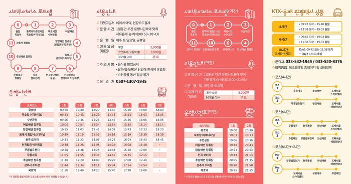 이번 동해시티투어버스 야간 운행은 동해시를 방문하는 관광객의 편의 증진과 야간 관광 활성화를 위한 조치로 오후 7시부터 9시 55분까지 2회 운영된다.