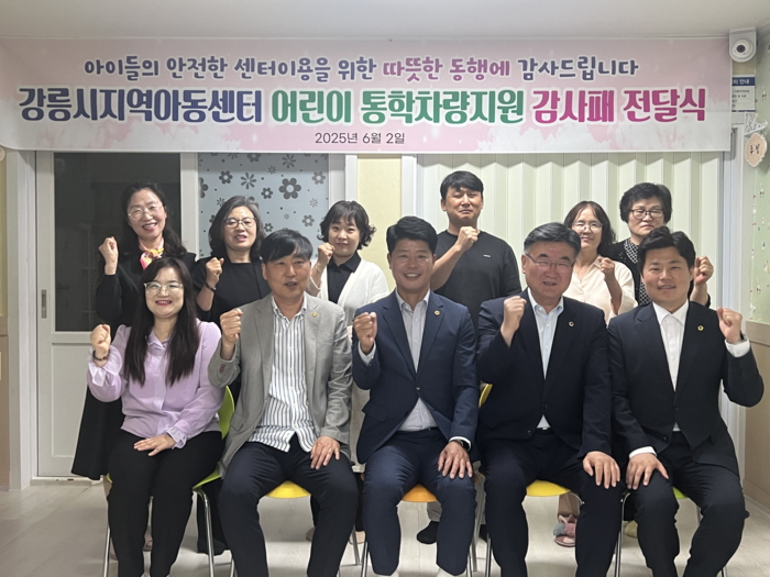이번 감사패는 강릉을 지역구로 두고 있는 박호균, 최승순, 김용래 도의원이 강릉시 지역아동센터의 10년 이상 노후된 어린이통학차량 교체에 기여한 공로를 인정받아 수여된 것으로, 2025년 총 예산 1억2천만원(도비 총 6천만원)을 확보하여 강릉시 소재 4개 지역아동센터(소망·산들바다·강남·성덕)에 각각 1대씩 새로운 통학 차량을 지원하게 되었다.