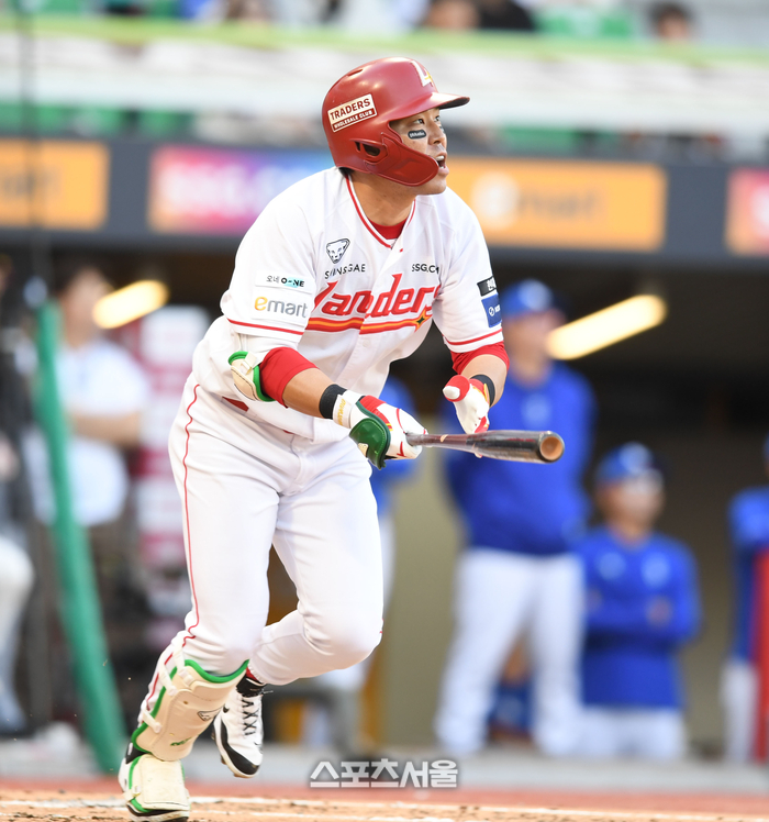 SSG 한유섬이 4일 인천SSG랜더스필드에서 열린 2025 KBO리그 삼성과 경기 2회말 타구를 바라보고 있다. 중견수 플라이 아웃.