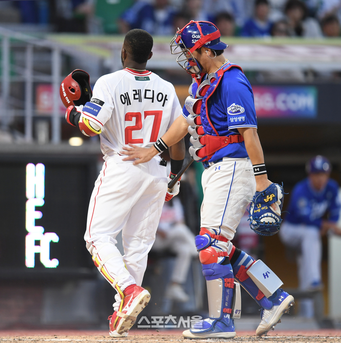 삼성 포수 강민호가 4일 인천SSG랜더스필드에서 열린 2025 KBO리그 SSG와 경기 5회말 2사 몸쪽 볼에 놀라 넘어진 상대 에레디아의 등을 털어주고 있다.