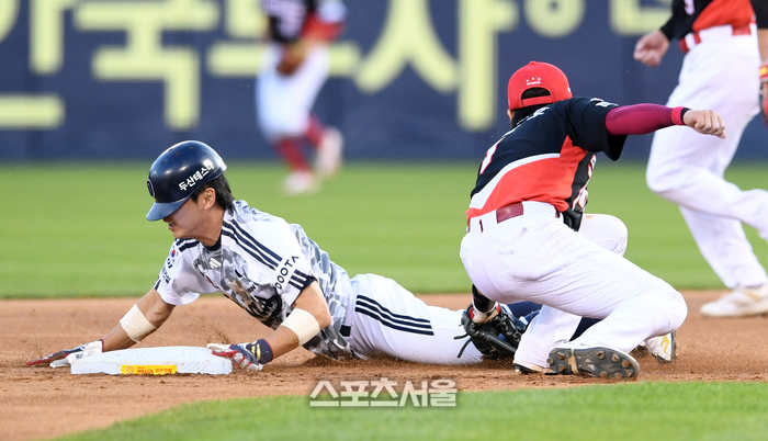 두산 정수빈(왼쪽)이 4일 잠실구장에서 열린 2025 KBO리그 KIA와 경기 3회말 무사 1루 상황에서 KIA 유격수 박찬호의 태그에 앞서 2루 도루를 하고 있다. 2025. 6. 4.