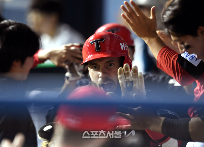 KIA 위즈덤이 4일 잠실구장에서 열린 2025 KBO리그 두산과 경기 6회초 1사 1루 상황에서 두산 투수 이영하를 상대로 2점 홈런을 친 뒤 동료들과 하이파이브를 하고 있다. 위즈덤의 시즌 10호 홈런. 2025. 6. 4.