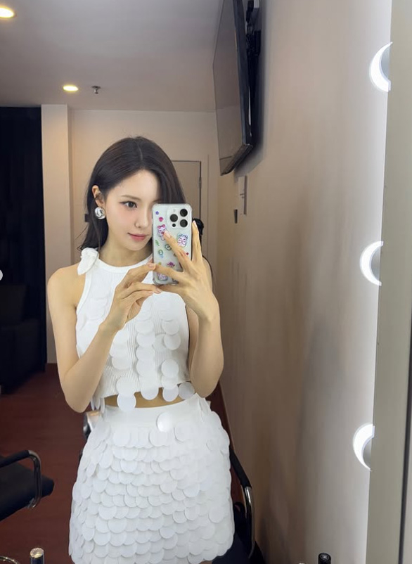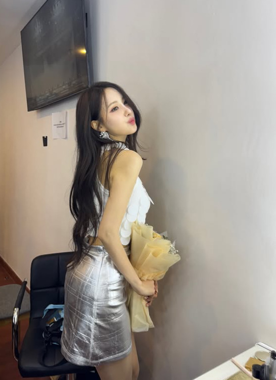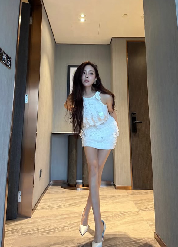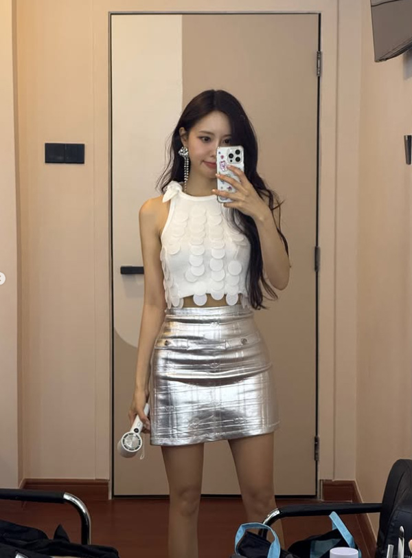 화이트 컬러의 민소매 탑과 스커트, 혹은 실버 미니 스커트 등 세련되고 트렌디한 룩을 완벽하게 소화해내며, 우아하면서도 세련된 분위기를 자아냈다. 긴 웨이브 헤어와 화려한 이어링, 그리고 은은한 메이크업이 어우러져 한층 더 빛나는 비주얼을 완성했다.
