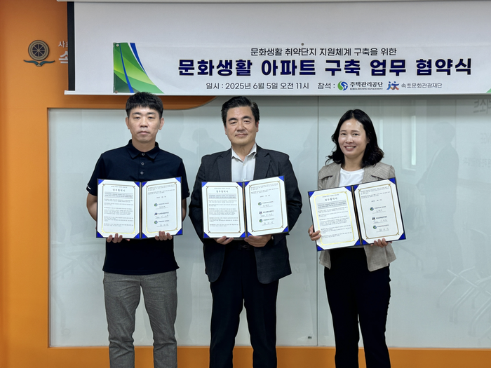 [스포츠서울ㅣ김기원기자](재)속초문화관광재단(이사장: 이병선)과 주택관리공단 속초권역(청초1관리소, 청대관리소)은 지난 5일, 공공임대주택 입주민 문화복지 실현을 목적으로 업무협약을 체결했다.