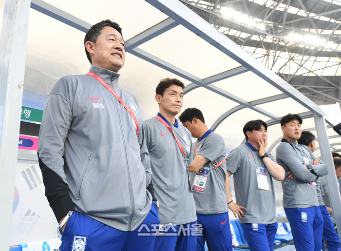 이민성 감독(맨 왼쪽)이 5일 용인 미르스타디움에서 열린 하나은행초청 한국과 호주의 U-22 축구구가대표팀 친선경기에 앞서 그라운드를 바라보고 있다. 2025. 6. 5.