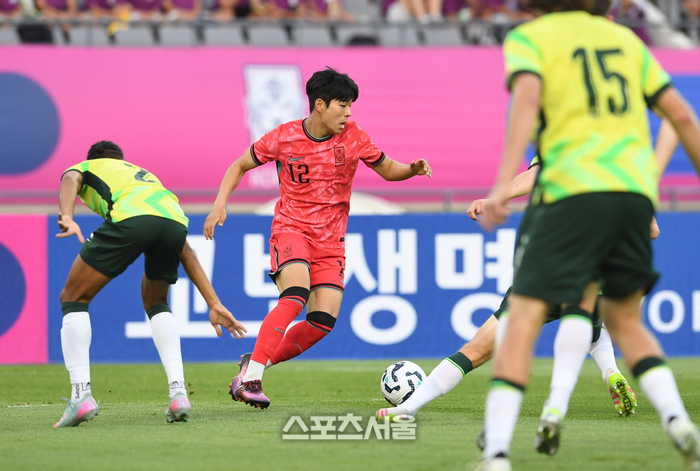 대한민국 U-22 축구국가대표팀의 채현우(가운데)가 5일 용인 미르스타디움에서 열린 하나은행초청 호주와의 친선경기에서 드리블 돌파를 시도하고 있다. 2025. 6. 5.
