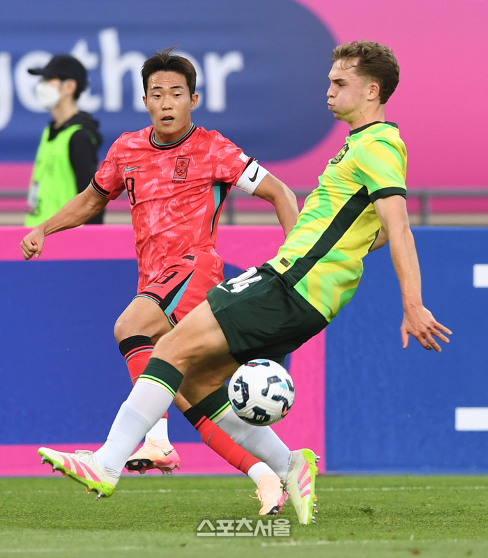 대한민국 U-22 축구국가대표팀의 이승원(왼쪽)이 5일 용인 미르스타디움에서 열린 하나은행초청 호주와의 친선경기에서 크로스를 올리고 있다. 2025. 6. 5.