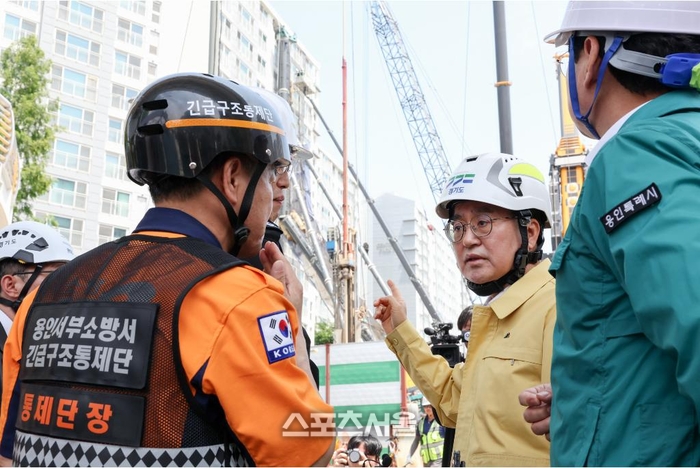 〔스포츠서울│수원=좌승훈기자〕김동연 경기도지사는 5일 밤 천공기(지반을 뚫는 건설기계) 전도사고가 발생한 용인시 기흥구 서천동 인덕원~동탄 복선전철 공사 현장을 찾아 사고 수습 상황을 점검했다.