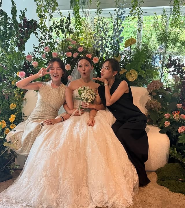 공개된 사진에는 지아가 미쓰에이 민과 함께 신부대기실에서 포즈를 취하고 있는 모습이 담겼다.