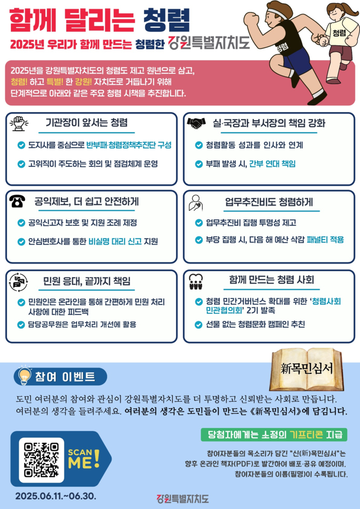 [스포츠서울ㅣ춘천=김기원기자]강원특별자치도는 오는 6월 11일부터 30일까지 20일간, 도민과 함께 청렴 문화를 확산하고자 ‘신(新) 목민심서 프로젝트’를 추진한다고 밝혔다.