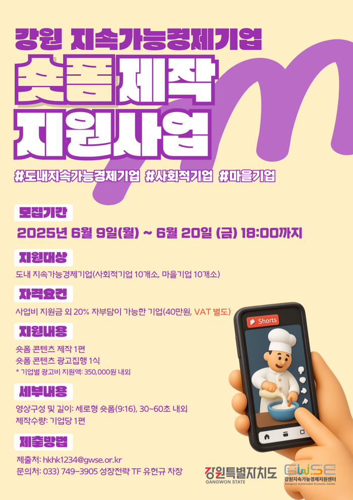 [스포츠서울ㅣ원주=김기원기자]강원지속가능경제지원센터(센터장 임지헌)는 강원특별자치도 내 지속가능경제기업(사회적기업, 마을기업)의 상품 인지도와 매출 향상을 위해 숏폼 제작 지원사업에 참여할 기업을 모집한다고 밝혔다.