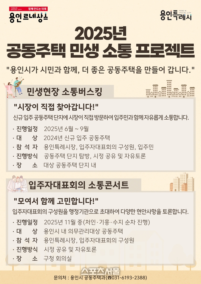 〔스포츠서울│용인=좌승훈기자〕경기 용인시는 ‘공동주택 민생 소통계획’을 수립하고 본격 추진에 나선다고 9일 밝혔다.