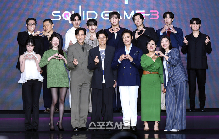 9일 오전 서울 용산구 서울드래곤시티에서 열린 넷플릭스 시리즈 ‘오징어 게임’ 시즌3 제작발표회에서 황동혁 감독과 출연 배우들이 취재진을 향해 포즈를 취하고 있다. 2025. 6. 9.