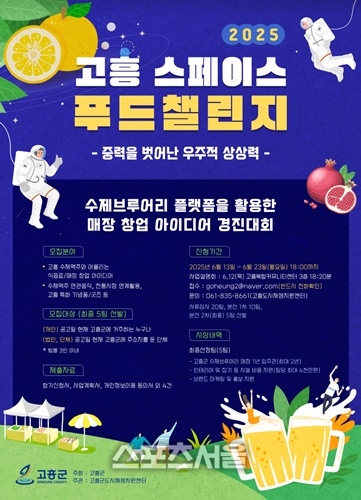 [스포츠서울┃조광태기자] 전남 고흥군(군수 공영민)은 ‘2025년 고흥 스페이스 푸드 챌린지’ 참가자를 오는 6월 13일부터 23일까지 모집한다고 밝혔다.