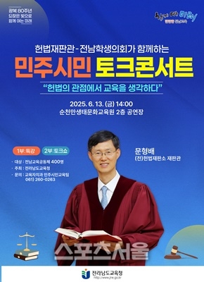 [스포츠서울┃조광태기자] 전라남도교육청(교육감 김대중)은 문형배 전 헌법재판소 재판관을 초청해, ‘헌법재판관-전남학생의회와 함께하는 민주시민 토크 콘서트’를 개최한다.