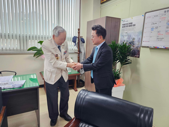 [스포츠서울ㅣ춘천=김기원기자]육동한 춘천시장이 9일 강원도보훈회관을 찾아 6·25 참전유공자회 강원도지부 박영택 지부장을 만났다.