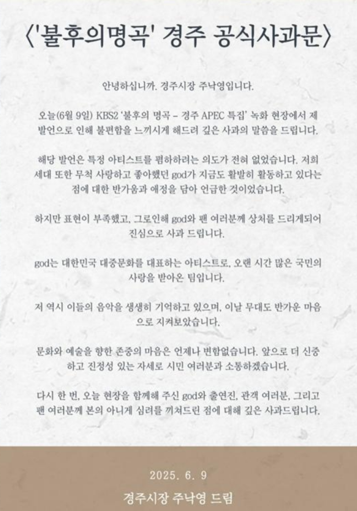주 시장은 “9일 KBS2 ‘불후의 명곡 – 경주 APEC 특집’ 녹화 현장에서 제 발언으로 인해 불편함을 느끼게 해드려 깊은 사과의 말씀을 드린다”라고 말했다.