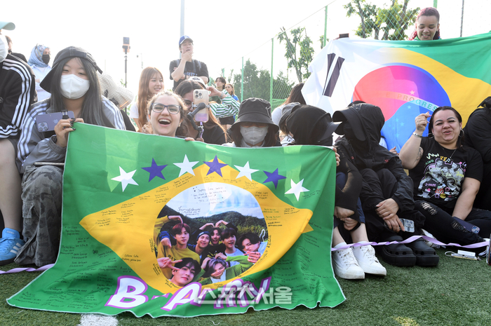 방탄소년단(BTS)의 RM(김남준)과 뷔(김태형)가 10일 전역을 하는 가운데 강원도 춘천시 신북읍 체육공원 일대에 팬들이 멤버들의 도착을 기다리고 있다.