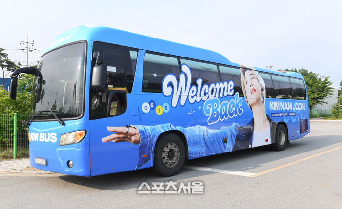 방탄소년단(BTS)의 RM(김남준)과 뷔(김태형)가 10일 전역을 하는 가운데 강원도 춘천시 신북읍 체육공원 일대에 RM의 전역을 축하하는 래핑 버스가 세워져 있다.