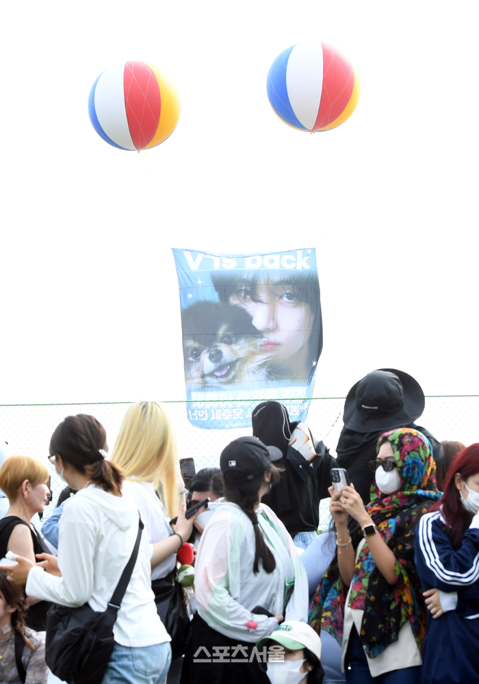 방탄소년단(BTS)의 RM(김남준)과 뷔(김태형)가 10일 전역을 하는 가운데 강원도 춘천시 신북읍 체육공원 일대에서 멤버들을 기다리는 팬들 뒤로 뷔 의 전역을 축하하는 애드벌룬이 떠오르고 있다.
