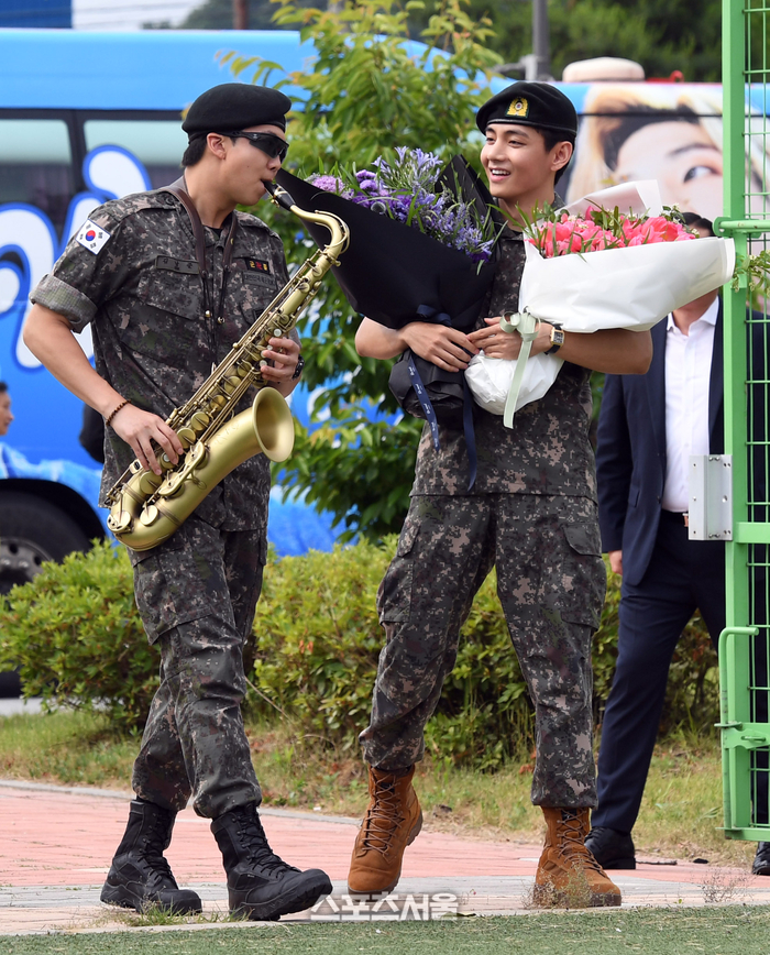 방탄소년단(BTS)의 RM(왼쪽, 김남준)이 10일 강원도 춘천시 신북읍 체육공원에서 진행된 전역 행사에서 색소폰을 연주하며 뷔(김태형)와 함께 행사장으로 입장하고 있다.
